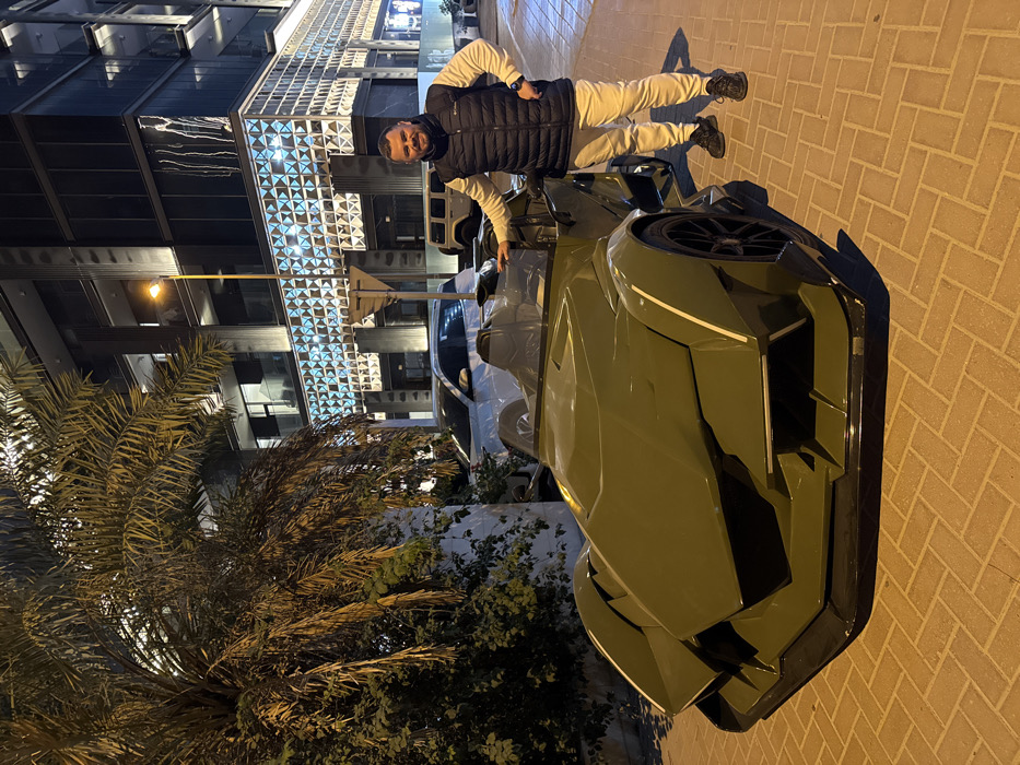 A man in a black vest and light-colored pants is standing on the side of a unique, green three-wheeled vehicle, likely a high-performance sports car. He has one hand on the vehicle and is looking toward the camera. The scene appears to be set at night in an urban area with a modern building with distinctive illuminated geometric designs in the background. There's also a palm tree and other greenery on the side of the street. The pavement is laid with interlocking bricks.