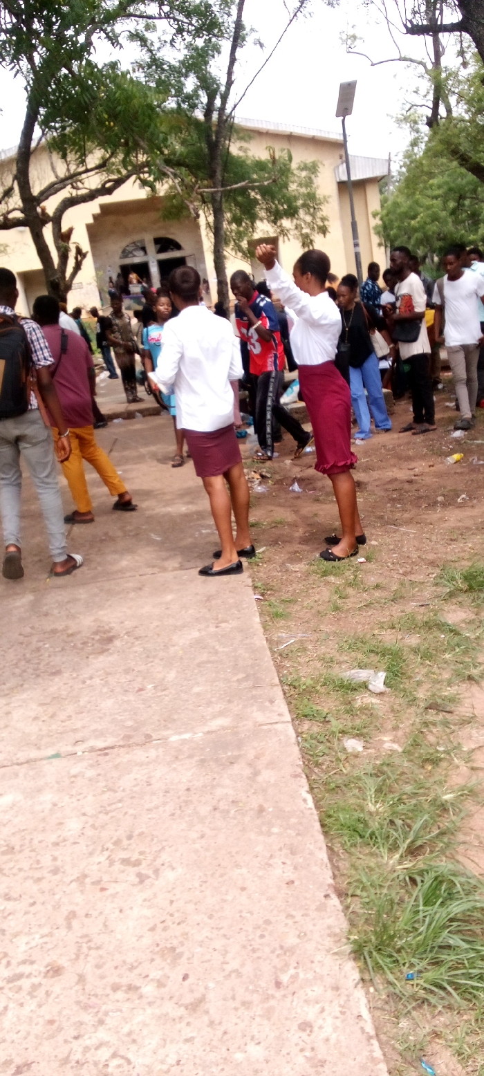 group of people standing in front of a building in Okigwe, Nigeria. The coordinates (latitude: 5.828, longitude: 7.397) correspond to a location in Okigwe. The building appears to be a school or government building, as several people are wearing uniforms. There are two women standing near the center of the image, both wearing white shirts and maroon skirts. The woman on the right is raising her right arm in a gesture of excitement or greeting. The woman on the left has her arms at her sides. There are at least ten other people in the image, all of them adults. The people are standing on a paved path lined with grass on one side. The path leads towards a building that is partially visible in the background. The building is light-colored and has a rectangular shape. There is a light pole in the background, with a streetlight at the top. The day is sunny and there are trees visible in the background.
