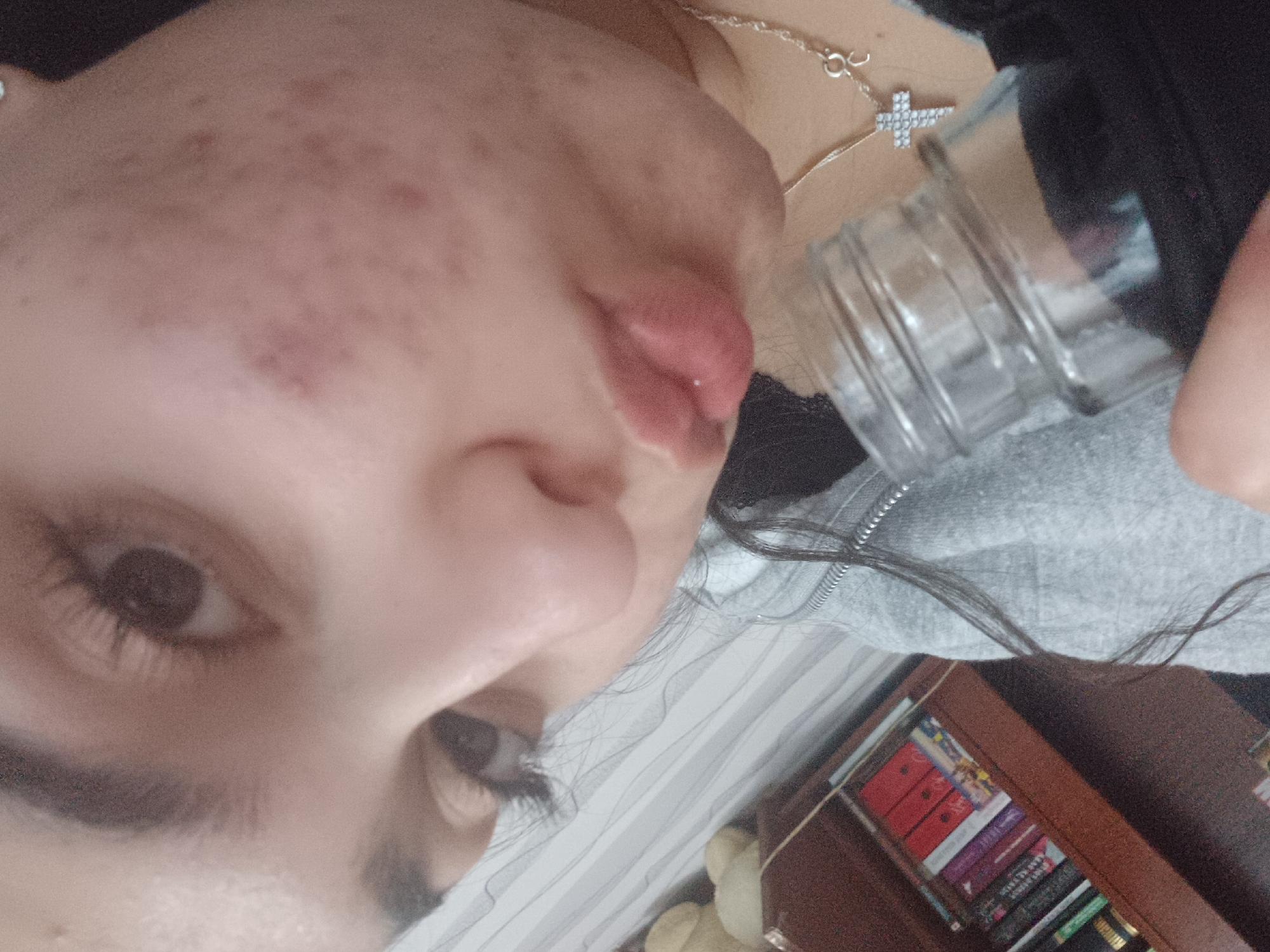 A close-up, angled photograph depicts a female individual indoors in the city of Gorna Oryahovitsa, Bulgaria. The subject's upper right face, neck, and shoulder are visible. She has dark hair, dark eyebrows, and visible eyelashes on her right eye, which is looking slightly upwards. Her lips are parted and puckered, with a small white dot on the lower lip. The right cheek and forehead show multiple red blemishes. She wears a light grey hooded garment with a visible zipper track and a silver-colored necklace featuring a small, encrusted cross pendant and a 'C' shaped charm. The individual is holding a clear glass bottle with a threaded neck in her right hand, partially obscuring the lower face. The background includes a light-colored stuffed animal, a wooden bookshelf filled with books (some with red spines), and a wall covering with vertical light grey and white stripes.