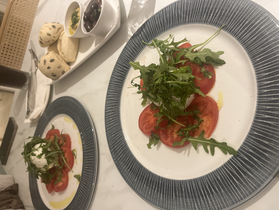 The image displays a dining table setting in an indoor establishment within Saint Paul's Bay, Malta. Two identical white ceramic plates with dark blue or gray radially striped rims are positioned on a light-colored table surface. Each plate holds a Caprese-style salad, consisting of multiple slices of red tomato, a central mound of white burrata or fresh mozzarella cheese, and a substantial topping of green arugula leaves, with visible olive oil drizzles. In the upper right background, a rectangular white serving dish contains several bread rolls, some with seeds, and two small white ramekins. One ramekin holds a yellow dip, and the other contains dark olives. A tall glass with a dark beverage, a folded white napkin containing silverware, and a dark-cased mobile phone are also present on the table. No individuals are visible.