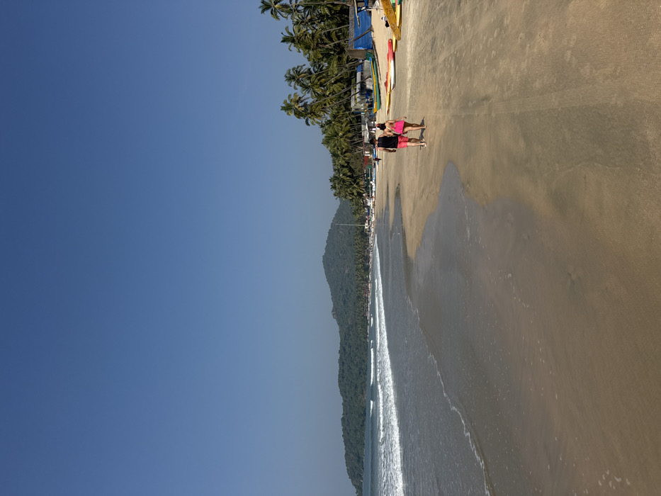 A beach landscape merges golden sand, turquoise water, and a clear blue sky. Palm trees line the edge of the beach, providing shade. Gentle waves caress the shoreline. Two individuals walk along the beach. Their reflections are seen in the wet sand. A lush, green hill rises in the background, adding to the scenic view.