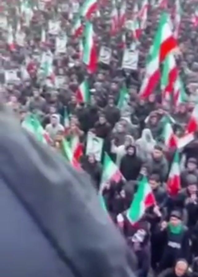 large crowd of people holding flags with the colors of the Iranian flag: green, white, and red. Some people are also holding portraits. The crowd is densely packed, and most people are wearing dark clothing. The chanting "Allahu Akbar" can be heard. It appears to be a demonstration or a rally.