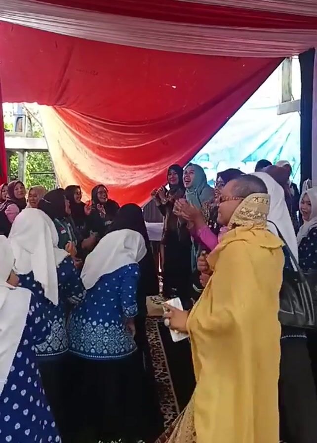 gathering of people, mostly women wearing hijabs, under a tent with red and white fabric. They are clapping and singing along to music being played by a band, seemingly performing for the crowd. Some are laughing and smiling, and the overall atmosphere appears celebratory. A woman in a yellow robe stands slightly apart from the group, holding what appears to be a wad of cash in her hand. The setting seems to be an outdoor event, possibly a wedding or cultural gathering. The camera is positioned among the crowd, providing a close-up view of the interactions.