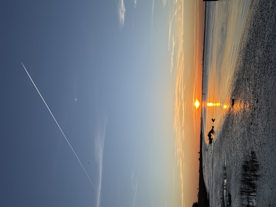 The image depicts a wide estuary or river at sunset in Great Yarmouth, United Kingdom. The scene is dominated by a low sun on the horizon, positioned in the mid-right, casting intense orange and yellow light across the water and sky. A prominent, elongated reflection of the sun stretches across the calm water towards the foreground. The sky is gradient, transitioning from deep blue in the upper left to lighter blue, then to warm orange and yellow hues at the horizon. A distinct, white airplane contrail extends diagonally from the upper left corner towards the upper-middle right. Below and to the right of the contrail, a faint, pale, circular object, identified as the moon, is visible. Scattered, wispy clouds are present, particularly in the lower sky, tinted by the sunset. A small, dark, indistinct object, possibly an aircraft or bird, is visible below the contrail in the upper-left quadrant. The foreground consists of exposed dark grey-brown mudflats or wet sand, textured with subtle undulations, suggesting low tide. Patches of dark, slender vegetation are visible in the far left foreground on the mudflats. Along the left side, a raised, grassy bank or levee curves into the distance. Several dark, irregular objects, possibly driftwood or debris, are scattered on the mudflats along this bank. Faint, dark silhouettes, possibly human figures, are discernible on the distant section of the raised bank on the left. Multiple dark, slender, vertical markers or posts are visible in the water, extending from the middle-right towards the distant horizon. The overall environment suggests a tidal estuary or large river mouth. No specific actions or interactions are clearly discernible beyond the natural environmental phenomena.