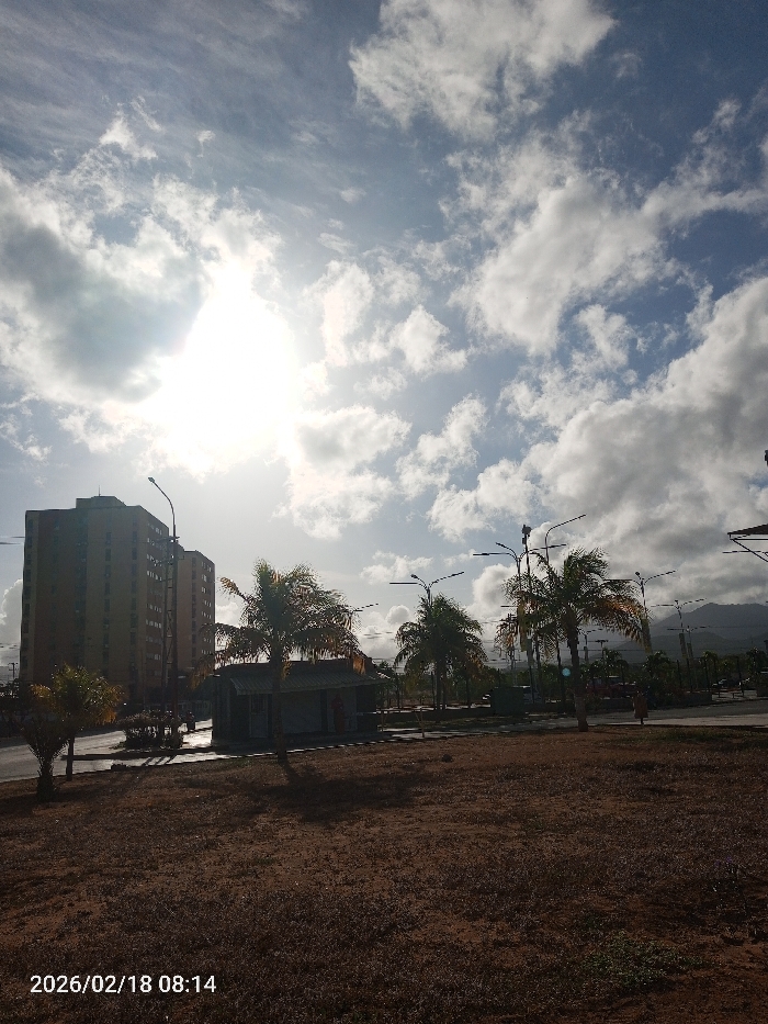 An outdoor scene in Juan Griego, Venezuela, captured at 08:14 on February 18, 2026, depicts a partly cloudy morning under bright sunlight