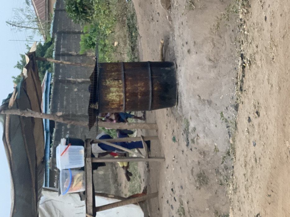 The scene depicts an outdoor, informal setting in Odo Ona, Nigeria, characterized by a dirt ground surface with sparse vegetation. In the midground, a rudimentary stall is constructed from rough wooden poles supporting a light-colored tarp roof. Beneath this roof, a wooden table holds two clear plastic buckets, one with a blue handle and the other with a red handle, containing indistinct items, along with a dark container. Behind the table, a person wearing blue trousers and a light-colored top is partially visible, standing. To their left, another individual in yellow clothing is lying on the ground. To the right of the stall, a heavily rusted and charred metal 55-gallon drum stands on an elevated dirt mound. A metal grate rests atop the drum, indicating use for heating or cooking. Near the drum, at least one child, wearing a pink top, is partially visible. The background features a grey concrete block wall, behind which a structure with a blue roof and distant green foliage are discernible under an overcast sky. A piece of wood lies on the ground near the base of the metal drum.