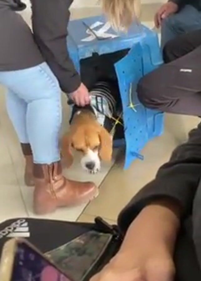 A medium shot shows a tan and white beagle being removed from a blue plastic pet carrier by a woman with long brown hair, wearing blue jeans and brown boots. The dog is wearing a black harness labeled "SERVICE DOG." The woman attaches a leash to the harness while the dog is on the floor. An older person wearing black athletic pants and Adidas shoes watches, looking at their cell phone, which displays a photo of two people. Another person in similar clothing sits next to them, with their legs obscured by the pet carrier. The floor is shiny and appears to be made of light-colored tile. Other people are faintly visible in the background.