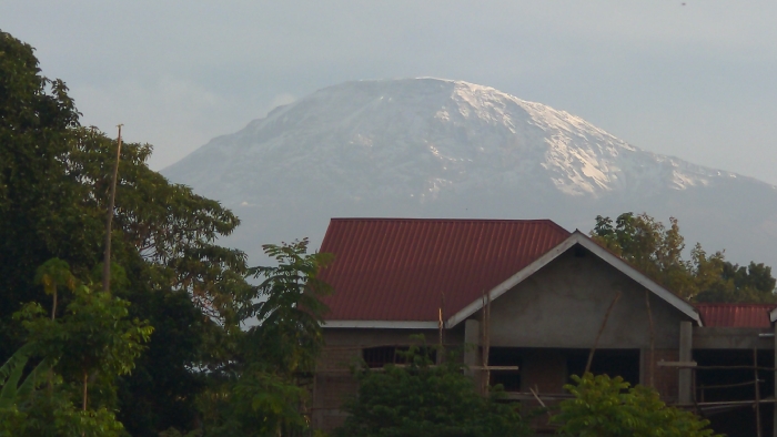A snow-capped mountain looms in the background, partially obscured by hazy skies. In the foreground, lush greenery contrasts with a partially constructed building featuring a red roof. The building appears to be made of concrete blocks and wooden beams, hinting at an ongoing construction project. The trees in the foreground add depth to the scene.