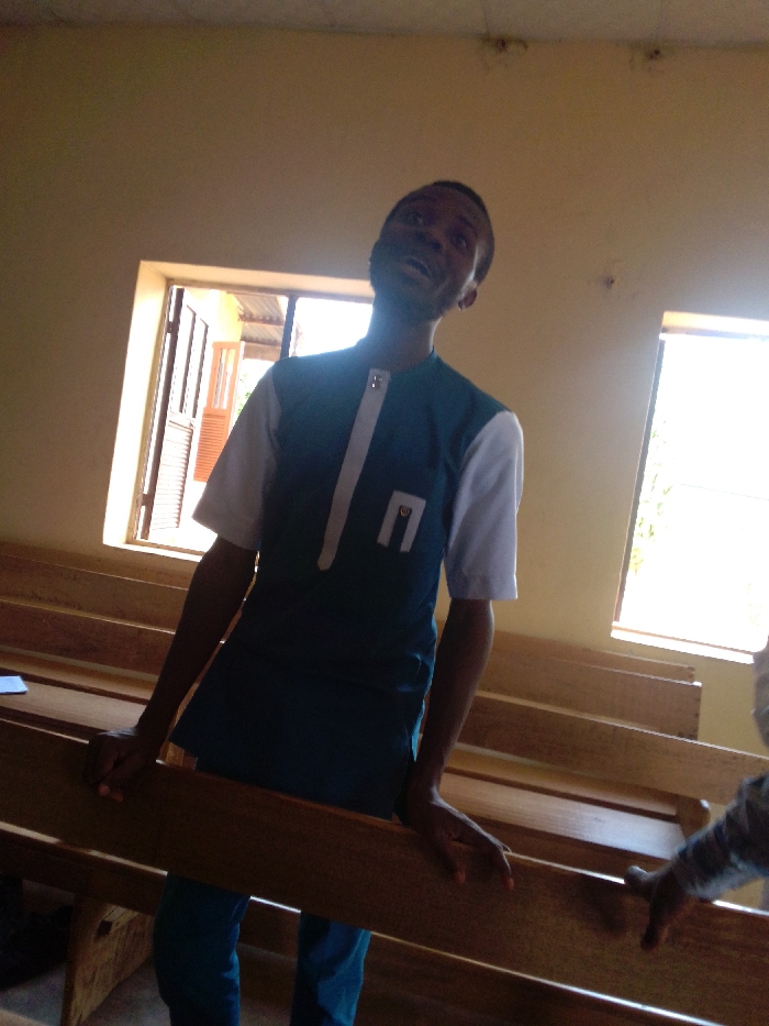 The scene is an indoor room in Saminaka, Nigeria, featuring light-colored walls and a ceiling
