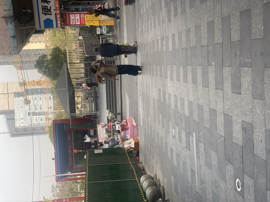 The image captures an urban street scene in front of Jiangxia Station (Exit B) of the Guangzhou Metro, located in Baiyun District, Guangzhou, China. The foreground consists of a grey and dark grey tiled pavement with a rectangular interlocking pattern. On the left, a green construction fence runs alongside the pavement, with three grey spherical bollards at its base. In the midground, a red-framed subway entrance structure displays Chinese characters identifying it as "江夏 (Jiangxia)" and "B出口 (Exit B)". Steps lead down into the station. Adjacent to this entrance, a street vendor operates a small stall on the pavement, presenting flowers, gift baskets, and other items on a pink tablecloth. To the right of the subway entrance, a dark grey canopy covers an area with metal barriers, and steps lead upwards. Further right, a convenience store with a blue sign featuring Chinese characters "便民 (Convenience)" has various packaged goods and drinks displayed outside. Multiple individuals are present. Centrally, a person wearing a light brown long-sleeved top and dark wide-leg pants walks towards the viewer, with their left hand raised near their face. Behind this individual, an older person in dark attire pushes a small, two-wheeled cart. Near the convenience store, a person with long, light-colored hair is walking towards the left. Additional pedestrians are visible near the subway entrance and under the canopy, either walking or standing. The background is dominated by modern high-rise buildings, some of which are under construction, indicated by visible orange tower cranes. The sky appears hazy. The scene is illuminated by natural daylight.