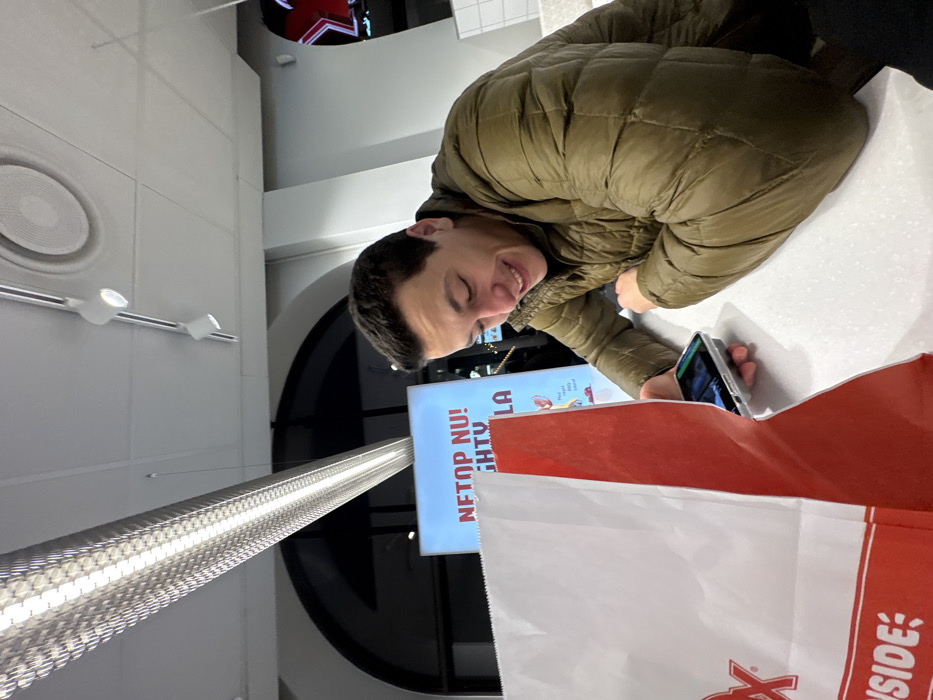 The image depicts the interior of a brightly lit commercial establishment, identified as a fast-food restaurant in Copenhagen, Denmark. A male individual, appearing adult with short dark hair and wearing a dark olive-green quilted jacket, is seated at a white countertop. He holds a smartphone with a light-colored protective case in his hands and is looking down at its screen, displaying a smile. To his left, a white and red paper bag, with "INSIDE:" partially visible at the bottom, rests on the countertop. In the background, a digital display screen shows the illuminated Danish text "NETOP NU!" (Right Now!) above "LA", with smaller red and white graphic elements. The ceiling features a long, metallic, perforated linear light fixture suspended centrally, two white track lights, and a circular ventilation vent. An arched window or opening in the distant background reveals a dark exterior, consistent with nighttime. A portion of a red star logo is visible in the upper right background, indicative of a fast-food chain brand.
