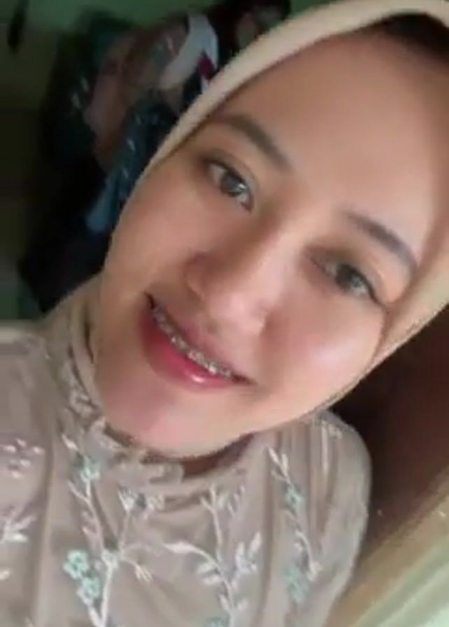 woman wearing a beige hijab and a dress with embroidered floral details. She is smiling and has braces on her teeth. In the background, there is a girl dressed in a scout uniform with a red and white neckerchief, carrying a plastic bag and a backpack. The room has a green wall and a black couch.