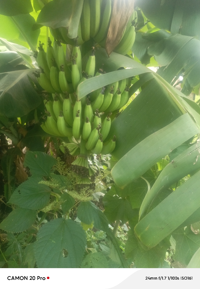 - "The image displays a close-up view of a large cluster of green, unripe bananas hanging from a banana plant" by FM-dR4Vw2, licensed under CC BY 4.0