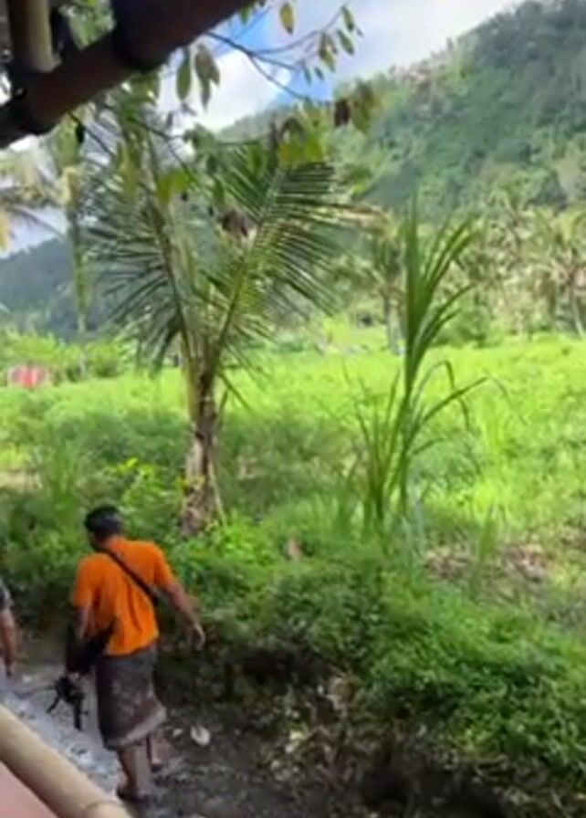 From under a roof supported by bamboo beams, two men are seen walking along a narrow path alongside a rice paddy in a valley, while one man is wearing an orange shirt, the other man is wearing a grey checkered shirt. The valley is lush, with many palm trees and other tropical plants. A large mountain covered in vegetation is in the background, with the sky a mix of blue and puffy white clouds.