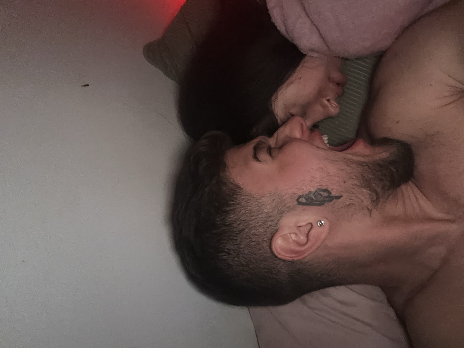 A man and a woman are lying in bed with their mouths open. The man has a short haircut, a beard, a tattoo on his neck, and an earring. The woman has dark hair and is lying behind him. A pink blanket is visible near her head. The scene seems intimate and potentially romantic or playful.