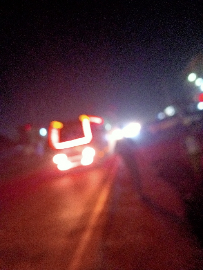 At night, blurry red, white, and yellow lights indicate the presence of a vehicle with a distinctive square shape. The road appears wet, reflecting some of the light. In the background, additional blurred lights suggest other vehicles or structures. The overall image has a grainy texture.