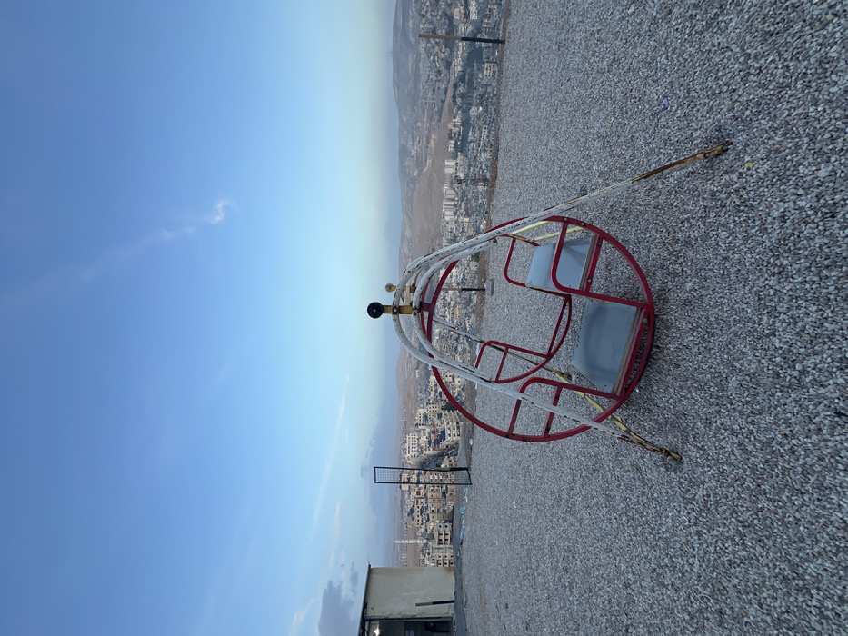 The image depicts an elevated, unpaved plot of land overlooking the city of Qudsaiya, Syria. In the foreground, a worn, red and white metal merry-go-round swing set with two light-grey seats stands on a surface covered in light-colored gravel. Rust is visible on the white painted support legs of the swing set. To the left, a small, light-colored rectangular building with a dark, open entrance is visible, adjacent to a vertical dark metal grid structure. Beyond this, a sprawling urban landscape of densely packed light-colored buildings extends across undulating terrain. A tall, slender minaret-like structure is discernible on the left side of the cityscape. The background consists of hazy, undulating hills under a clear blue sky with sparse, wispy clouds. No individuals are present in the scene. The lighting suggests either early morning or late afternoon conditions.