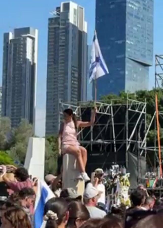 crowd of people gathered outdoors in what appears to be a public square or plaza in a city. A woman is sitting atop a pillar, holding an Israeli flag. She is wearing a light pink dress and white sneakers. The crowd is primarily composed of young people. Behind the crowd and the woman on the pillar, there is a large structure that appears to be part of a stage or performance area. Beyond this structure are several tall buildings, with one bearing the signs "ISRAEL CANADA" and "EY." Some people in the crowd are holding Israeli flags. The weather seems to be sunny, and the sky is clear.