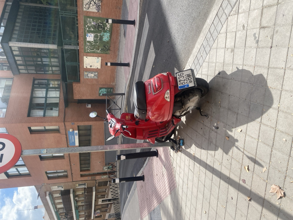 A red Vespa scooter, bearing Spanish license plate "8236 GBH," is parked on a light grey tiled sidewalk