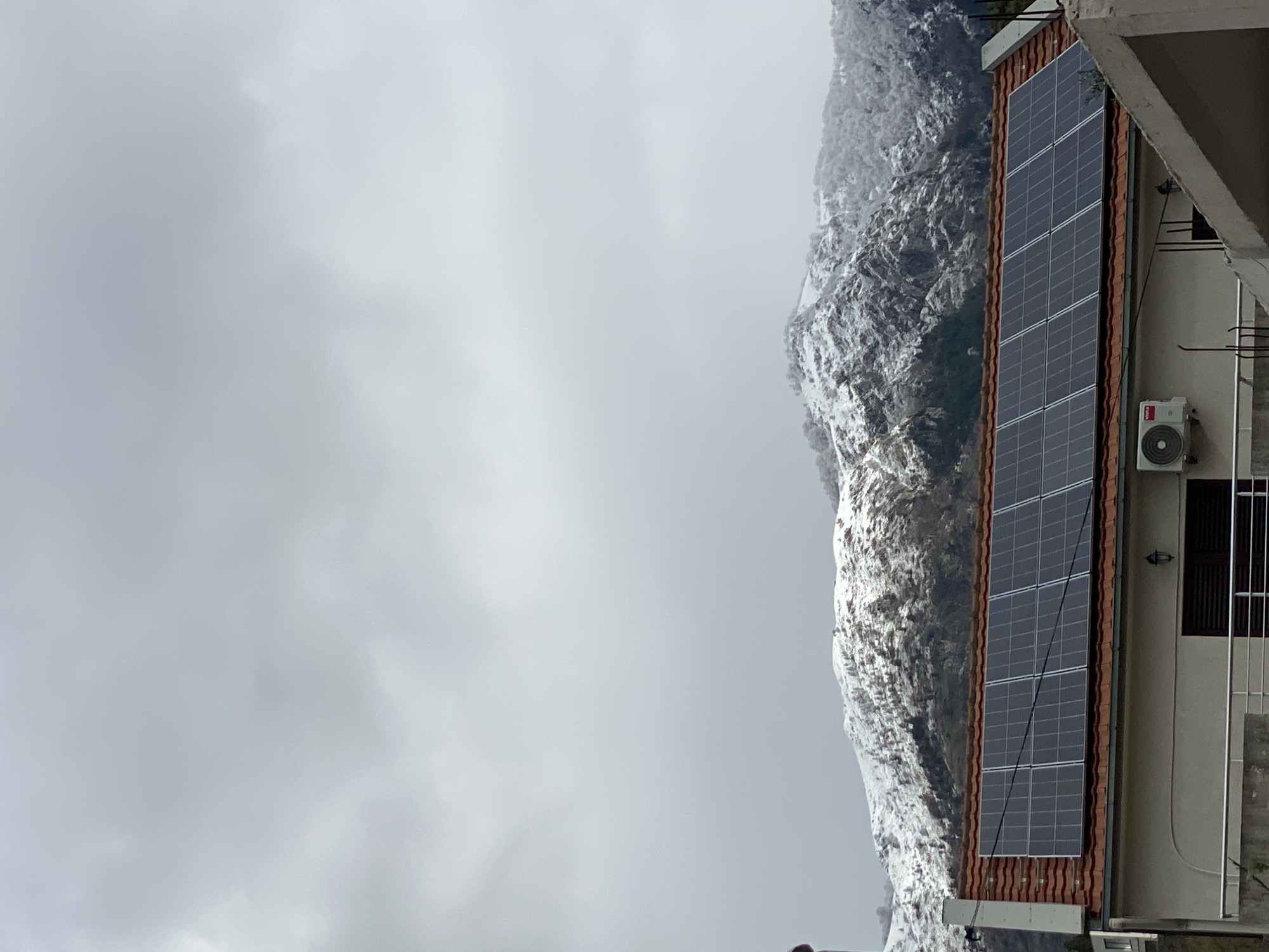 The image displays a panoramic view of a residential building in Budva, Montenegro, set against a backdrop of snow-capped mountains under an overcast sky. In the midground, the upper portion of a light-colored building is visible, featuring a reddish-orange tiled roof. Mounted on this roof are multiple dark photovoltaic solar panels, arranged in several rows and columns. Below the roofline, on the building's light-colored facade, an external air conditioning unit is affixed, accompanied by a wall-mounted light fixture. A window or door with dark, closed shutters is present on the same level. Partially visible in the lower left is a silver metal railing, suggesting a balcony or terrace, with a concrete structure visible in the lower right foreground. No individuals are present in the scene, and no specific actions or interactions are depicted. The background is dominated by rugged mountains, heavily dusted with snow and featuring sparse, snow-covered trees, all under a uniformly grey, cloudy sky.