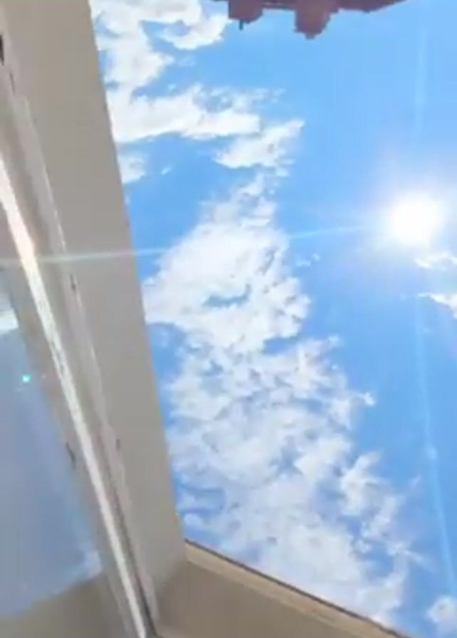 low-angle view looking up toward an open window and a section of an off-white or beige building exterior. The window is partly open, revealing a view of a bright blue sky with scattered clouds. A person's dark hair and part of their forehead are visible at the bottom of the frame. There is a noticeable lens flare in the scene. The building's architectural details include angled surfaces and horizontal grooves or molding.
