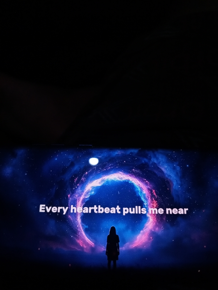 A person stands silhouetted against a cosmic backdrop of swirling blues and purples, shaped like a portal or vortex. Overhead, a light source shines. White text overlaid on the scene reads, "Every heartbeat pulls me near." The colors are vibrant against an otherwise dark image.