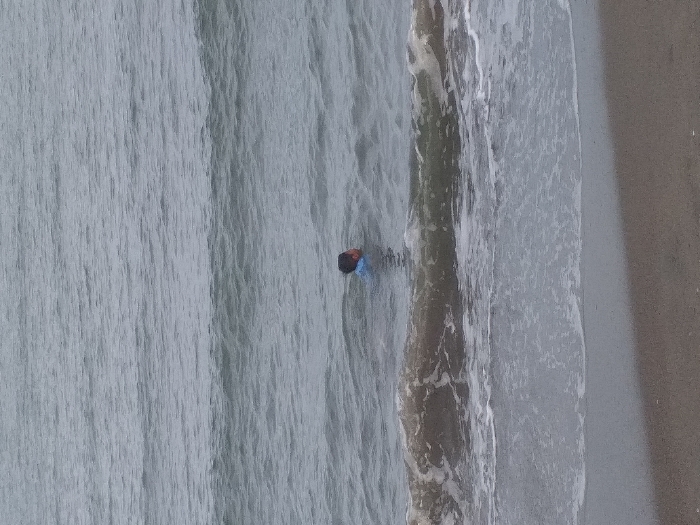The image depicts a coastal scene in Lhokseumawe, Indonesia. A single individual, wearing a light blue shirt, is positioned in the ocean, partially submerged from the chest down. The water is greyish-blue and choppy, with a distinct breaking wave visible between the individual and the immediate sandy shoreline. The individual's head is above the water surface, and they appear to be facing slightly to the right of the frame. The foreground consists of a strip of dark, wet sand. No other individuals or objects are present within the observable scene.