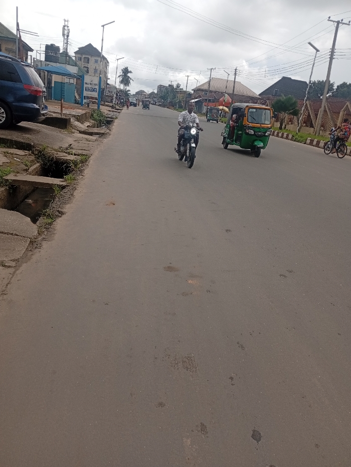 The image depicts a street scene in Aba, Nigeria, under an overcast sky. The view is looking down a paved asphalt road that recedes into the distance. In the foreground, the asphalt road occupies the majority of the frame, showing minor discoloration and patches. To the left, a concrete curb separates the road from a narrow, unpaved strip of ground and an open concrete drainage ditch containing some vegetation. A small concrete slab bridges a portion of this ditch. A dark blue minivan or SUV is parked on a raised concrete area on the far left. On the roadway, a male individual wearing a light-colored, patterned short-sleeved shirt is operating a dark-colored motorcycle, moving away from the viewer towards the middle of the road. Further ahead and to the right of the motorcycle, a green and yellow motorized trishaw, commonly known as a Keke Napep, with "21FB" visible on its front, is also in motion. In the distant background on the right, two individuals are seen riding a bicycle near a patterned fence. Along the left side of the street, several multi-story buildings are visible, including one with a blue lower facade and a water tank on its roof, partially obscured by power lines and utility poles. A sign for "ACCESS BANK" is partially visible. Tall, modern-looking streetlights with solar panels are positioned along both sides of the road. On the right side, beyond the road and a decorative patterned fence, additional buildings and sparse vegetation are present. Numerous overhead utility wires crisscross the sky.