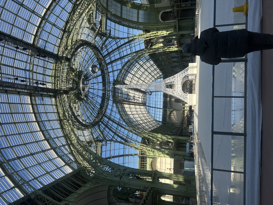 The image captures the interior of the Grand Palais in Paris, France, featuring its distinctive vast, arched glass roof and intricate green metal framework
