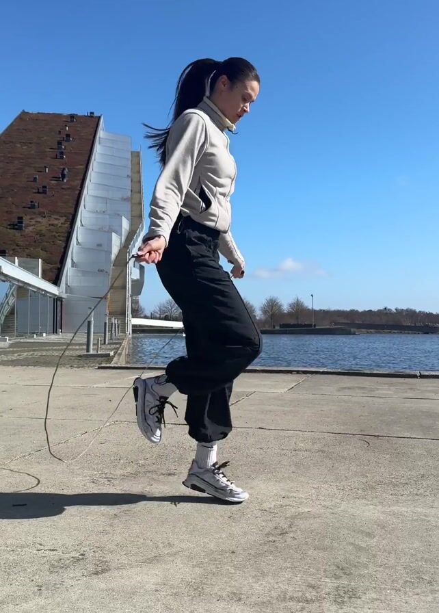 A young woman with long dark hair is jump-roping outdoors on a sunny day. She wears a light gray zip-up jacket, black pants, and light-colored sneakers. She faces right and jumps rope repeatedly. Behind her is a building with a white and silver architectural feature and a brown roof. In the background is a body of water under a clear blue sky. The area where she jumps is a concrete surface.