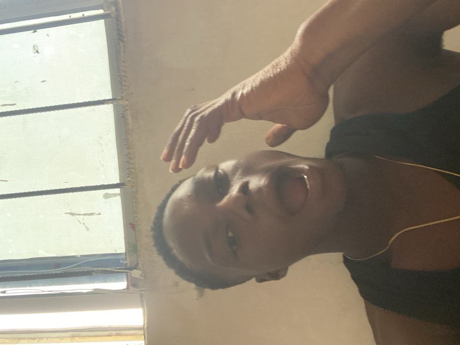 A close-up image depicts a young dark-skinned male positioned indoors. He has short, dark hair and is wearing a black sleeveless shirt with a thin gold-colored chain visible around his neck. His mouth is open wide, as if shouting or exclaiming, and his eyes are wide. His right hand is raised to the right side of his head, fingers slightly spread, with the palm partially facing forward. The background features a light-colored, possibly off-white wall with visible texture. Above the subject's head, a window with vertical metal bars is visible, through which diffuse daylight is entering. The specific location within the city of Igbessa, Nigeria, cannot be determined from the visual information provided in the image.