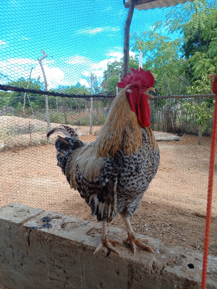 A rooster stands on a concrete block wall in an outdoor enclosure in Altagracia, Venezuela
