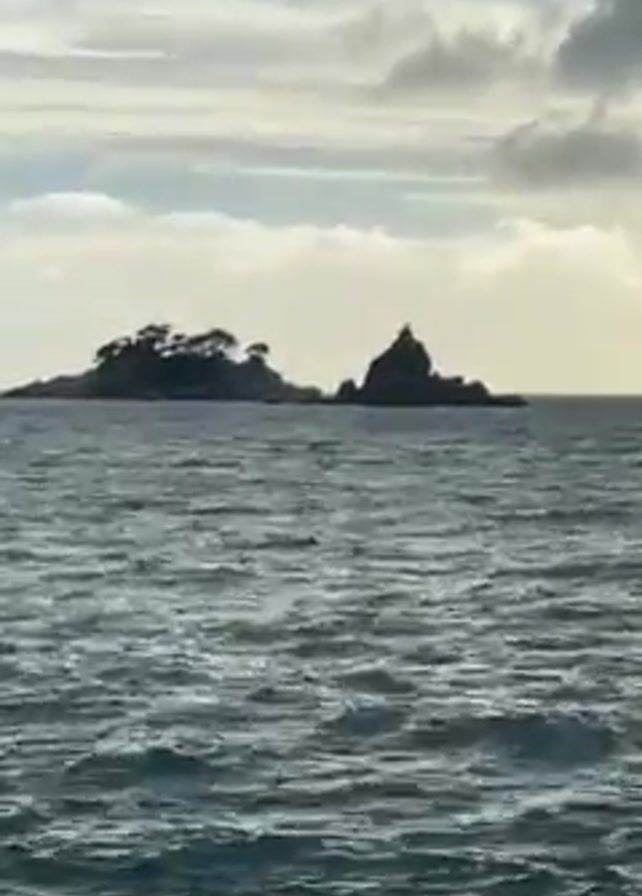 two small islands in the ocean under a cloudy sky