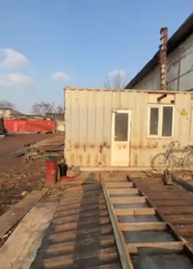 n industrial yard with several shipping containers. One of the containers is repurposed into a small office or living space with a door and a window. A set of stairs leads up to the container. A bicycle is parked nearby. In the background, there are other containers, a small blue truck and a small orange forklift driving between the containers on a dirt road. The sky is blue with scattered clouds. The ground is littered with debris and metal scraps. The overall environment appears to be a working industrial site.
