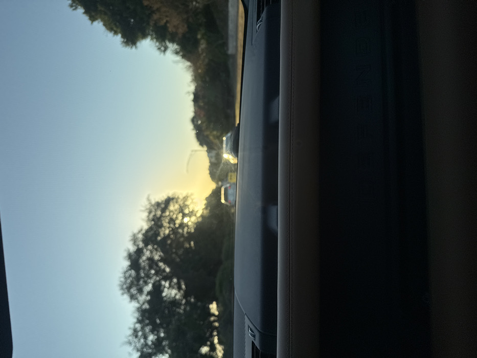 Looking out from inside a car on a sunny day, the sky is a clear blue merging with a golden hue on the horizon where the sun shines through trees