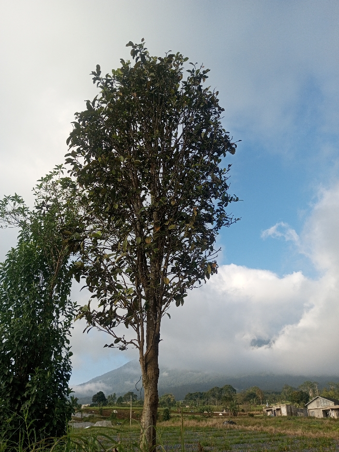 A tall tree dominates the foreground, its leaves dense against a partly cloudy sky. Another tree, slender and green, stands to the left. Beyond, a landscape unfolds with fields, vegetation, and a few buildings. A mountain partially obscured by clouds provides a distant backdrop. The sky is a mix of clear blue and white clouds.