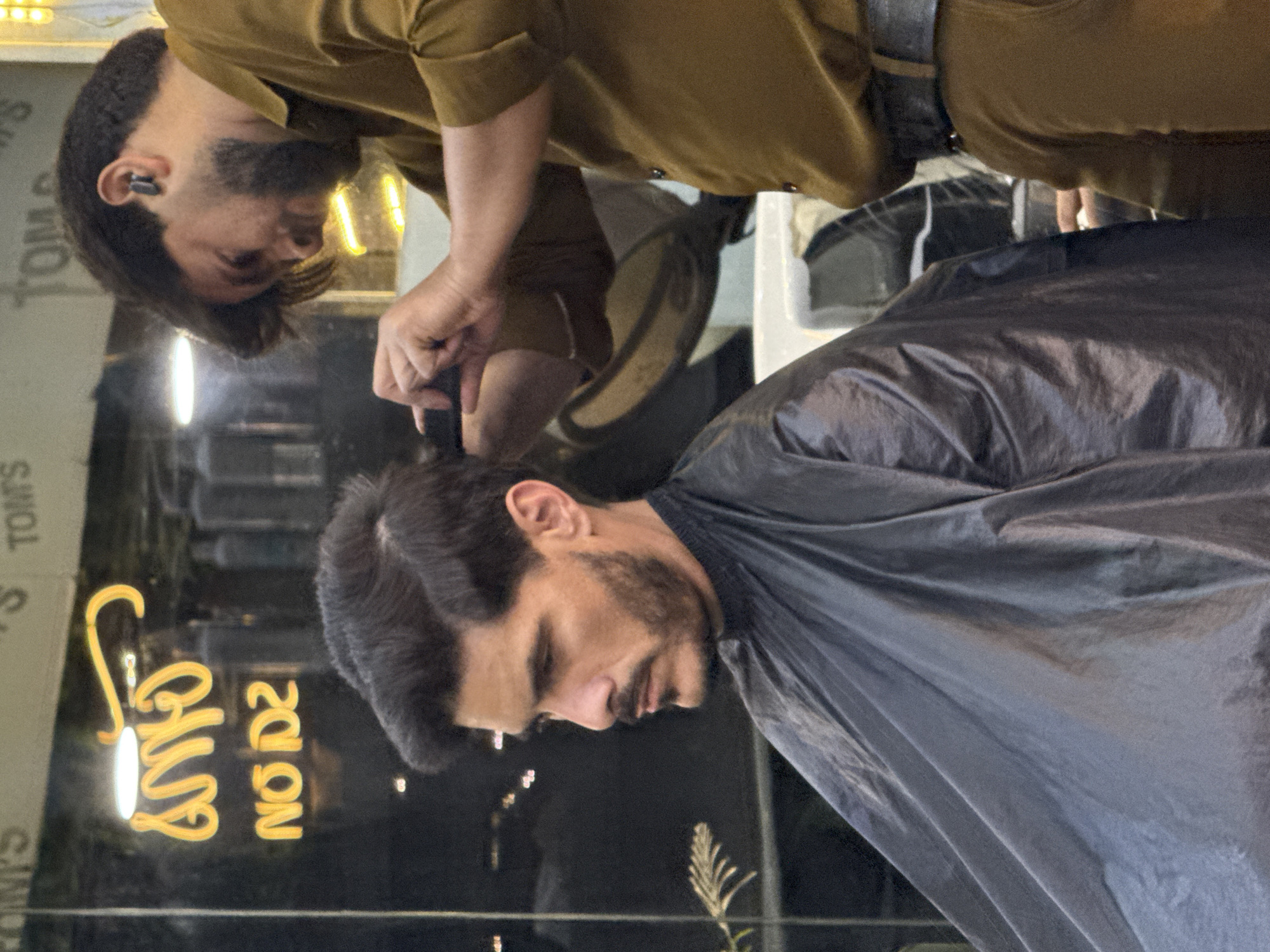 - "The image depicts an indoor scene within a barber shop, identified by a reflected yellow neon sign displaying "TOM'S" and "NO D2", located in Delhi, India" by FM-FJLwi1, licensed under CC BY 4.0