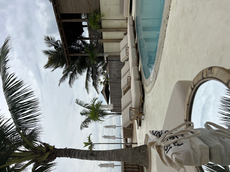 A tropical resort scene includes a pool with lounge chairs, palm trees, and beach umbrellas visible in the distance. An open-air structure with thatched roofing looms above the pool area. A woven tote bag sits on a lounge chair near a circular mirror. The sky is overcast. The image is rotated ninety degrees counter-clockwise.
