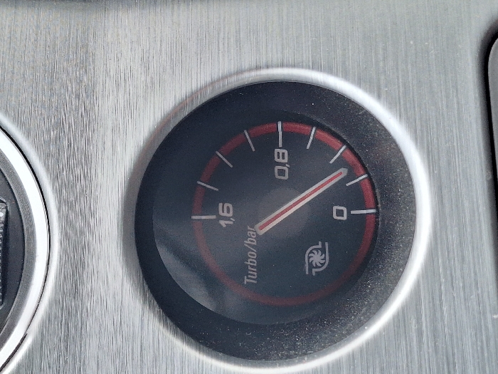 The image depicts a close-up view of a circular turbo boost gauge within the interior of a vehicle