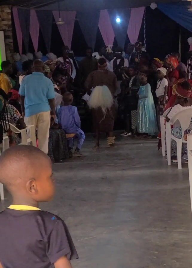 gathering of people, including adults and children, in what appears to be a large hall or indoor event space. In the center, a person is dressed in traditional attire. The person has a large, white, shaggy headdress and is wearing what seems to be a brown, draped garment, and is bending down. The crowd is looking towards this person. A young boy, wearing a dark shirt with a yellow collar and blue jeans, is walking towards the center of the hall. He is looking to his left towards the people gathered around the central figure. The room is decorated with alternating pink and dark triangles hanging from the ceiling. White plastic chairs are placed along the sides of the space, and some people are seated. A bright light shines from the ceiling. The floor is concrete.