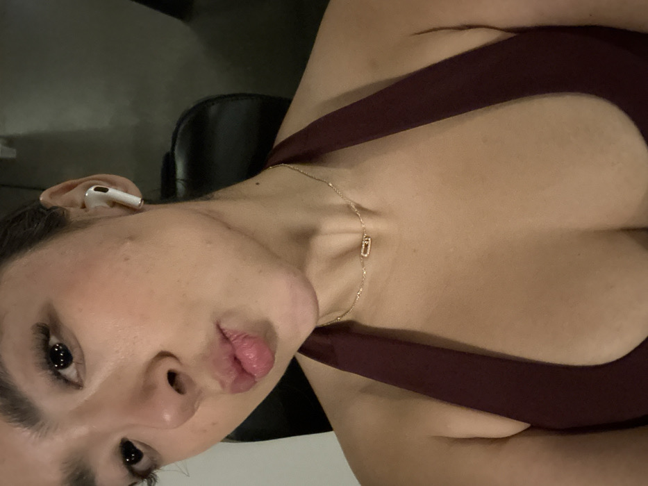 A woman is shown in a close-up, likely a selfie. She wears a maroon sports bra and a delicate gold necklace with a rectangular pendant. An AirPod is visible in her left ear. Her face is in focus, exhibiting soft, pink lips and light skin. The background is blurry and indistinct, possibly suggesting she is indoors, seated in a chair. The image is rotated.