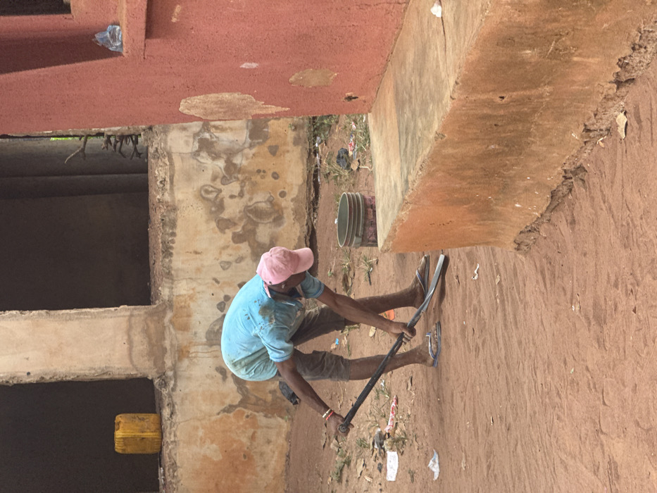 In Aguata, Nigeria, a lone male individual is depicted outdoors, bent forward at the waist. He wears a light blue t-shirt, stained with what appears to be dirt or mud, dark knee-length shorts, and blue and white flip-flops. A pink baseball cap covers his head. His arms are extended downwards, holding a dark-colored shovel with both hands, its blade positioned on the reddish-brown dirt ground. A red wristband is visible on his left wrist. The immediate environment consists of loose, reddish-brown soil, marked with small indentations and scattered pieces of white and colored litter. To the right, a solid red-orange concrete structure, possibly a low wall or bench, extends into the foreground. In the mid-ground, behind the individual, a light gray bucket with dark banding is visible on the ground, next to additional scattered debris and sparse vegetation. Further behind, partially obscured, are sections of weathered, light-colored concrete or stucco walls belonging to a larger, unfinished or deteriorated building. This structure features open window or door frames, and a prominent concrete pillar. A yellow plastic jerrycan rests near one of the building's walls in the background. The scene is illuminated by natural light, casting no distinct long shadows, suggesting an overhead light source.