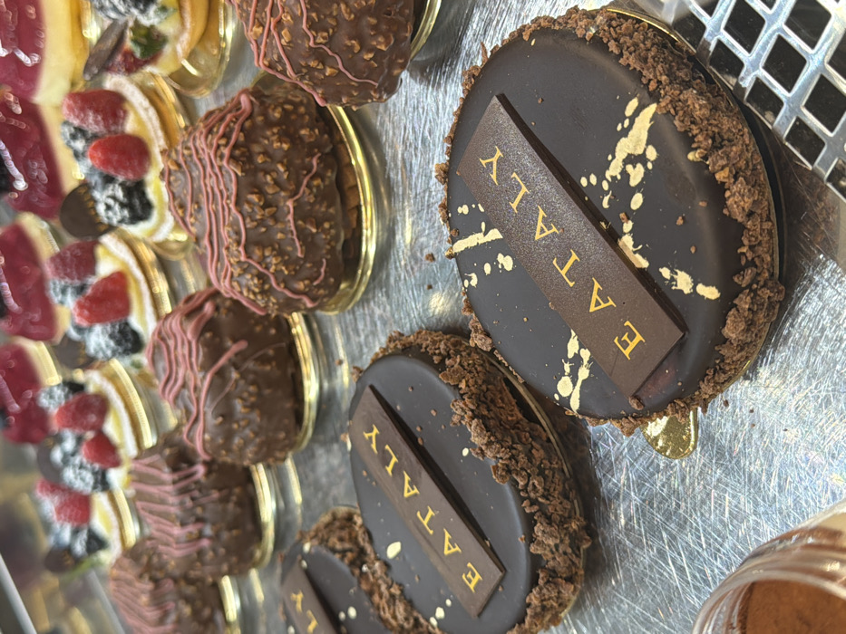A display of elegant desserts, including miniature fruit tarts with vibrant red berries, and several small cakes covered in a glossy chocolate coating. Some cakes are adorned with a sprinkle of nuts and delicate pink drizzle. Two prominent oval cakes, edged with a crumbled topping and bearing the inscription "EATALY" on a rectangular piece, capture attention with their dark chocolate glaze and scattered gold leaf.