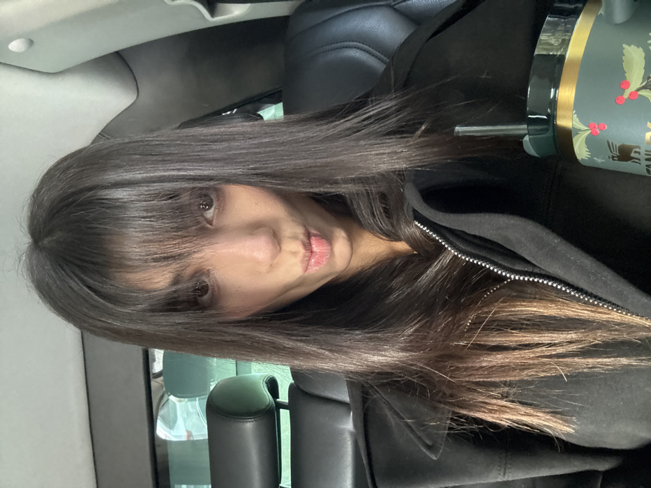 A young woman poses in a car. She has dark, straight hair with bangs, and is wearing a black zip-up jacket. She has fair skin and her lips are slightly pursed. A cup with a straw sits to her right. The car interior is visible, including the seat and door panel. The image is well-lit.
