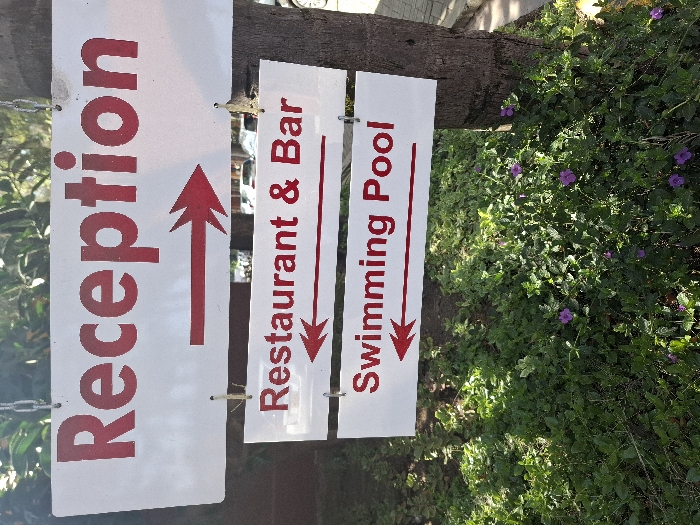 Three white signs with red lettering and arrows are hanging on a tree trunk in Karagita, Kenya (latitude: -0.757, longitude: 36.437). The top sign points to the right and reads "Reception". The middle sign points to the left and reads "Restaurant & Bar". The bottom sign points to the left and reads "Swimming Pool". The signs are mounted on a tree trunk with green foliage at the base and some small purple flowers visible.