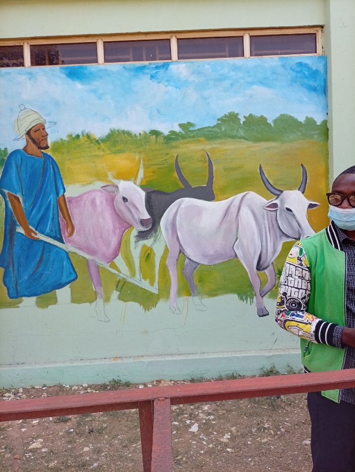 A full-length vertical image captures a partial view of a person standing in front of a mural on a building wall in Unguwar Shanu, Nigeria