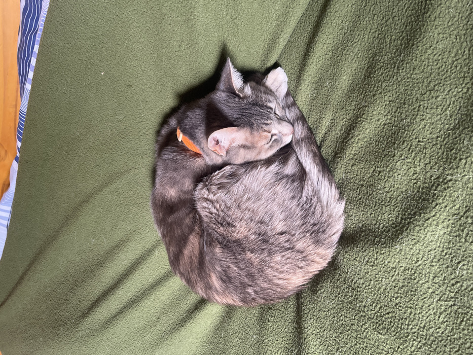 - "An indoor scene in Ushuaia, Argentina, depicts a domestic cat, likely a dilute calico or tortie with mottled grey and light brown fur patterns, curled tightly in a sleeping position on an olive-green fleece blanket" by FM-rplFE3, licensed under CC BY 4.0