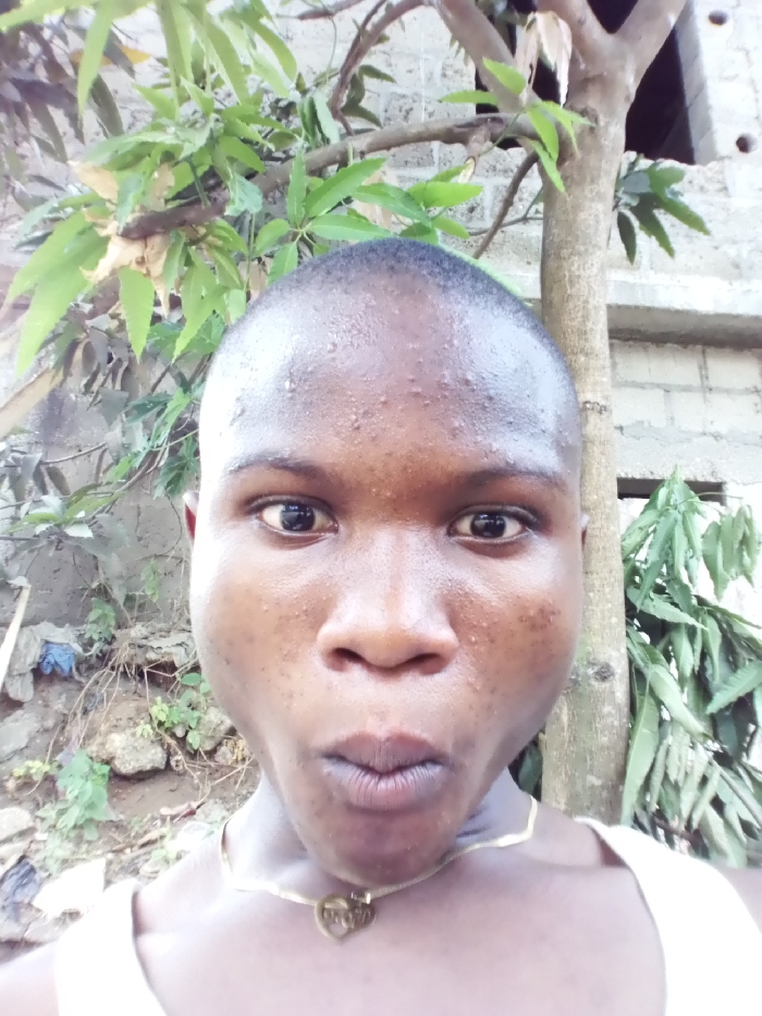 A close-up photograph depicts a single individual with dark skin and a closely shaven head, positioned centrally and looking directly into the camera. The subject exhibits visible perspiration on the forehead and cheeks. The eyes are wide open, and the mouth is pursed into an "o" shape. The upper chest is visible, clad in a light-colored garment, possibly a tank top. A gold-colored chain necklace with a heart-shaped pendant, appearing to bear an inscription, is worn around the neck. The background presents an outdoor scene indicative of a residential or undeveloped area within Owerri, Nigeria. To the subject's left, a rough ground surface of soil and small rocks is visible, interspersed with green vegetation and a piece of blue fabric debris. A concrete block wall is partially obscured behind this area. To the subject's right, the trunk and foliage of a tree, possibly a mango, are prominent. Another concrete block wall, consistent with local construction, is visible behind the tree. The overall environment suggests an urban or semi-urban setting. The precise location within Owerri, Nigeria, beyond its general characteristics, cannot be determined from the visual information.