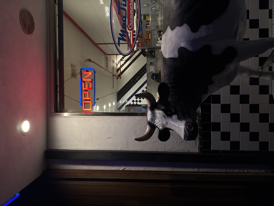 exterior of an ice cream shop at night. A neon "OPEN" sign hangs in the window, reflecting a red glow on the adjacent wall. A "Moo-Time Creamery" sign is visible inside. A large, decorative cow statue stands near the window. Black and white checkered tiles line the lower portion of the shop's exterior wall, contributing to the classic ice cream parlor aesthetic.