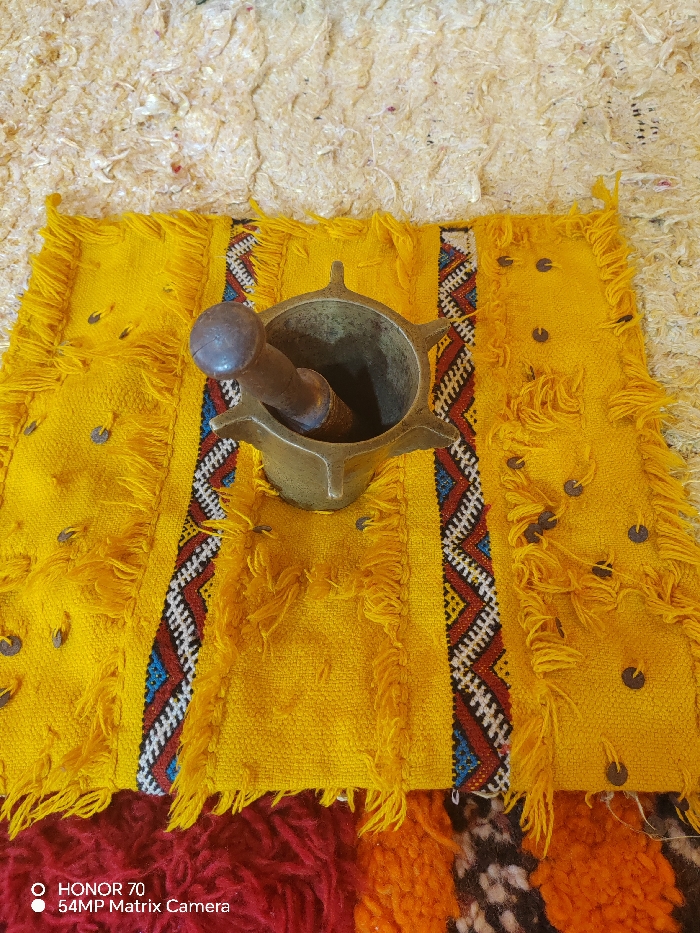 A metal mortar with a wooden pestle rests on a yellow textile. The textile has decorative fringe and small, dark circular objects attached. The textile features a vertical stripe with geometric patterns in red, blue, and white. The background consists of a cream-colored, textured surface and a multi-colored rug with red, orange, and brown tones. A watermark indicates the image was taken with an Honor 70 camera.